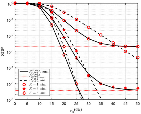Another observation is that the impact of the number of relays selected to forward signal to user D2. As a further development, Figure 3 plots the SOP of NOMA scheme versus a different number of relays. As observed from the figure, we can see that the higher number of selected relays also strongly affect secure performance of RS-NOMA scheme compared with small variations at OMA. The most important thing is that the RS-NOMA furnishes with relay providing remarkable improvement in secure outage performance. This is due to the fact that there are more chances to achieve improved signal to serve far NOMA user. This observation confirms a role of relay selection to enhanced secure performance in the considered RS-NOMA.