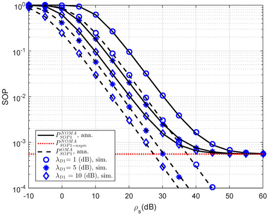 Comparison study on SOP of NOMA and OMA for User D1 versus as changing (, dB, ).
