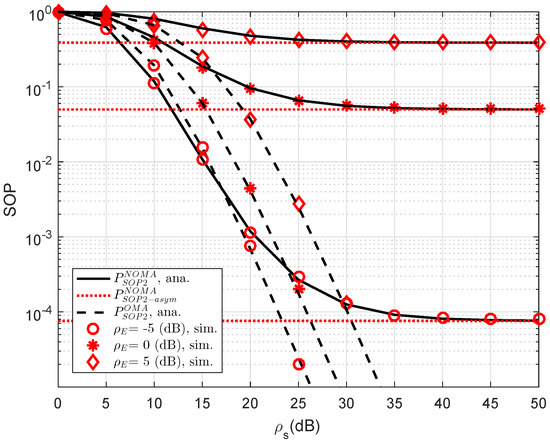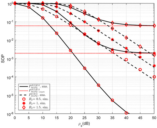 In Figure 5, the SOP performance of the RS-NOMA and OMA schemes with different threshold rates at D2 are compared to provide an impact of the required rates on secure performance. We setup the main parameters as , dB, . It can be seen from both figures that the proposed RS-NOMA scheme can remarkably enhance the secure performance compared to the OMA scheme. Performance gaps between NOMA and OMA can be seen clearly at higher threshold rate .