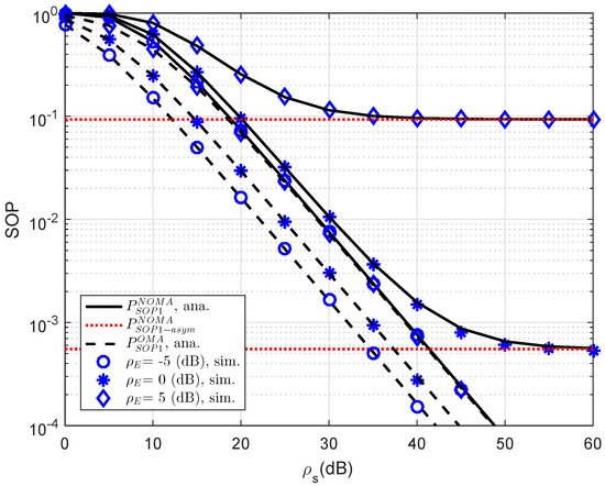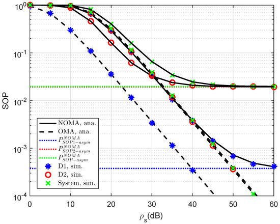 As an important parameter of NOMA, the impact of different threshold rates on the SOP performance of user D1 is simulated in Figure 2. The reason for such observation is that the threshold rate is the limited secure capacity as performing probability calculation. At high threshold rate, the performance gap between NOMA and OMA can be observed clearly. In addition, asymptotic evaluation shows that outage behavior is constant because such outage does not depend on . This observation can be seen in the following experiments.