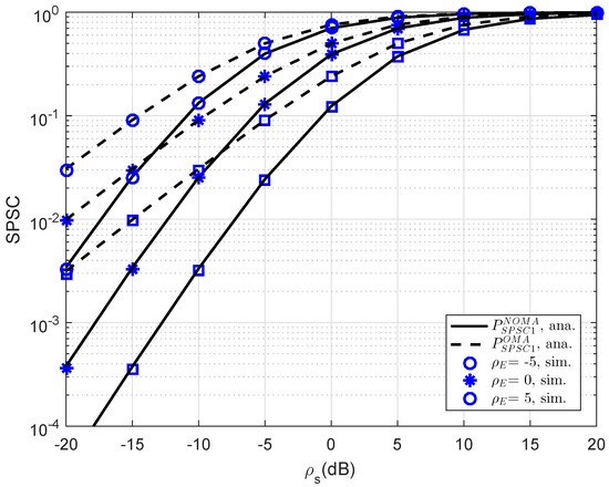 In Figure 10, further simulation is performed for consideration at D1; the SPSC performance versus transmit SNR is presented. As can be seen, at lower SNR regime, SPSC performance between OMA and NOMA is similar. This observation will change at higher SNR. The strong characterization of eavesdropper leads to varying SPSC performance. As seen in other simulations, this result verifies the exactness of the analytical computations presented in the previous section.