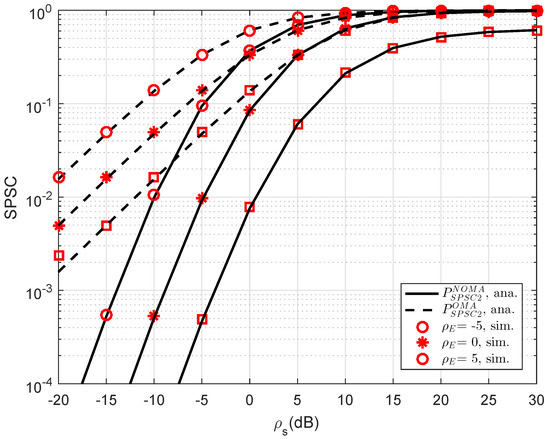 In Figure 11, the curves of SPSC versus transmit SNR at D2 are presented. As can be seen, the analytical results can match the simulations very well. Obviously, by varying channel gains of the eavesdropper, the SPSC will be changed. Meanwhile, the performance gap between OMA and NOMA in such SPSC is linear in the range of SNR from −20 dB to 5 dB and it does not exist if the SNR is greater than 10 dB. Like previous simulations, this result coincides with the analysis in analytical computations presented in the previous section.