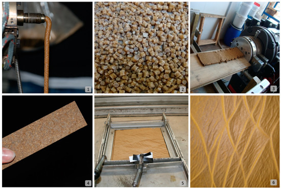 Up: (1) Compounding, (2) pelletising, and (3) extrusion processes. Down: (4) Cut panel, (5) the thermoforming-process of a thermoplastic biocomposite panel, and (6) a thermoformed final finished panel (photos: Dahy, H.; republished [8]).
