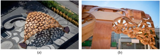 The BioMat research pavilion 2017/2018 is a 3.6-metre-high shell structure with a 9.5-m span, covering an area of 55 m². It was located on the campus of the University of Stuttgart in the city centre between August–December 2018, as shown in Figure 2. Its special feature is the modular construction of lightweight, single-curved elements that form a double-curved shell with individual segments consisting of veneer-reinforced elastic biocomposite cores. The structure is supported by three crossed beams.