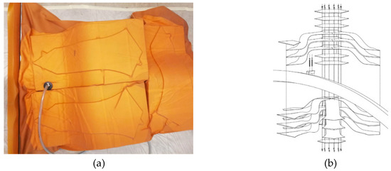 The key advantage of using this material is the easy possibility of adjusting the mechanical properties along with the diverse needed geometrical variations. Through the arrangement of the special veneer reinforcing materials—known as 3D veneer—with multiple thermoplastic reinforcing perpendicular ribs on the backside of the longitudinal arranged veneer strips, the structural behaviour of the veneer laminated lignocellulosic biocomposite and wooden sandwich panels were improved. Accordingly, the needed target mechanical properties were reached. The modular elements of the pavilion were single-curved fabricated, and the arrangement of the elements’ layers and connections through the smart settled design and the chosen smart numbering system, together with the data management that was applied, enabled the final double-curved shell to be successfully constructed, meeting the highest possible accuracy within the construction phase. Diverse detailing solutions for the layering of the biocomposite sandwich panels and their connection systems have taken place. In Figure 3, one of the four main detail solutions of the pavilion is illustrated.