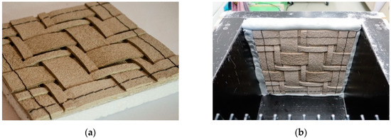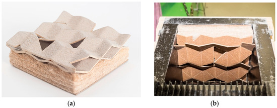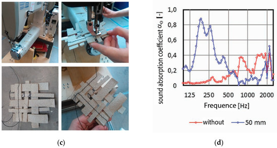 The panel was manufactured through cutting the lignocellulosic composite panels developed in the PLUS project and tailored in a geometrical order with an industrial six-axis robotic head, guaranteeing the textiles in the outside surface being set as connectors. The acoustic absorption is improved upon fixing the panel 50 mm away from the back wall, as shown in Figure 4d. In addition to the acoustic absorption, thermal insulation was also reachable in the same panel. Furthermore, improvement in the acoustic absorption of the developed panel could be guaranteed through adding a damping material of thin lignocellulosic textile layer between the tailored biocomposite layers and the biofoam core.