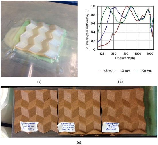 In Figure 5, the fabrication methods of the outside layers of the sandwich panels experimenting with thermoforming at different temperatures are illustrated. In the acoustic absorption graph, two resonance tips were already reached without wall spacing. By varying the wall distance, a third resonance maximum was deduced; thus, the best effect to absorb a broadband was reached.
