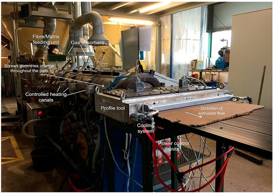 The lignocellulosic composite recipes used here were based on the patent [17] of the author and further developed into three successive research projects, namely: “PLUS”, “Bioprofile”, and “Bio-Faserplate”, which was led by the author too. The recipes varied between mixtures of straw and other lignocellulosic fibres in combination with bio-based HDPE, classic petro-based HDPE, and PLA separately. In combination with a thermoplastic elastic binder to adjust the elasticity, the geometrical flexibility of the extruded panel was reached. The panels were extruded using a twin-screw natural fibre extruder machine after adjusting the controlling conditions. Among these, gas absorbers were placed for excess vapors from the natural fibre existed, as shown in Figure 6, to guarantee the quality and avoid having air bubbles in the cross-section of the panel after extrusion. The panels were supported on thin wooden frames and did not need further modification of heat adjustments for thermoforming as in the previous example (5.2). The design of the shown lounge in Figure 7 was developed by the author and her research team. The outcome was exhibited in the foyer of the Faculty of Architecture in Stuttgart in 2017, in the Hannover Exhibition, and in the Composites Europe Exhibition in Stuttgart in Germany, which were both in 2018.