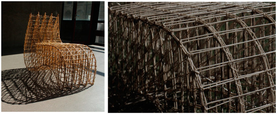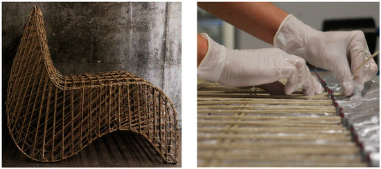 The lignocellulosic hemp fibres were left stretched, and tension forces were applied through adjustments at the anchor points until the fibre–matrix composite completely solidified. Extra zip-ties were bound on the fibres surfaces, and pressure was applied to prevent the fibres from movement during the crystallisation process and to avoid delamination. In a separate process, two flat sheets were designed and fabricated from the same materials; then, they were bent to act as a structural balancing closure to the chair profiles from up and down, forming the seating surface from above and the bottom of the chair from below, as shown in Figure 9. The separate chair sections were brought into an equilibrium state through combining the upper and lower actively bent sheets with the longitudinal chair profiles. This was done manually through weaving fibres that also passed in a resin bath combining the longitudinal profiles and the sheets. Two X-bracings were adjusted underneath the seating area, at the back and in the front edge underneath the seating area to guarantee lateral resistance and avoid distortion.