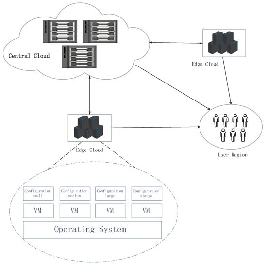 To tackle the problem of limited resources in a mobile device, offloading tasks to clouds is an efficient way to augment the computation capacity of a mobile device. However, due to the geographically diverse distance from different mobile users to cloud data centers, it is difficult to guarantee similar proper response time for all users. Actually, traditional cloud infrastructure may not satisfy the stringent delay requirements for such mobile applications. To mitigate the problem of latency constraint for delay-sensitive applications, a new cloud paradigm, named mobile edge computing (MEC), have been proposed []. In the field of academia, MEC is also similar to fog computing [], cloudlet [], small cell cloud [], and Follow me Cloud []. In a MEC cloud platform, a number of small scale and dedicated servers are deployed at the network edge close to mobile users. Users can run an immersive application smoothly in their mobile handset by offloading computation-intensive tasks to edge clouds in close proximity to them. One or more large scale cloud data centers, called central clouds, to cooperate and synchronize with edge nodes, are also included in a MEC cloud platform. Figure 1 shows an example of a MEC cloud platform.
