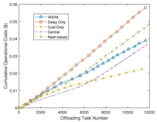 Figure 3 shows the cumulative operational costs of five strategies. We observe that the cumulative costs incurred by our strategy IASVA are lower than Cost-Only and Central strategy. The operational costs incurred by the Nash-based strategy is higher than that incurred by our strategy. This is because our strategy can dynamically allocate resources to different types of tasks under the delay constraint. The Nash-based strategy sometimes would lead to the problem of resource over-provisioning for tasks. The gap between the overall cost of our strategy and that of the optimal solution is also presented in Figure 3. The optimal strategy is a centralized strategy, which need collect the whole information of all mobile users. Although the optimal strategy can save more operational costs, our decentralized strategy can be more suitable to the practical environment.
