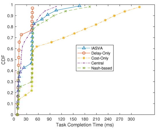 Figure 4 shows the cumulative distribution function (CDF) of task-completion time of different strategies. From this figure we can observe that, in most cases, the task-completion time incurred by our strategy is close to that incurred by the Central strategy. The Nash-based strategy would achieve higher task completion time than that incurred by our strategy. This is because our strategy would allocate higher configuration VM to tasks, when task processing time affect the user’s QoS. The central strategy can obviously obtain the lower task processing time than ours. However, in the practical environment, collecting all information of users in the central strategy would incur additional delay, which would aggressively affect user’s QoS.
