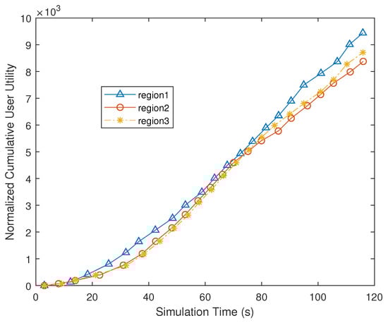 To show the fairness, we also compare the user utility among different regions. Figure 5 depicts the cumulative user utility in different regions when our strategy is used. We can observe that the cumulative utility obtained from these three regions are close to each other, clearly confirming that our decentralized strategy can maintain fairness among users of different regions.