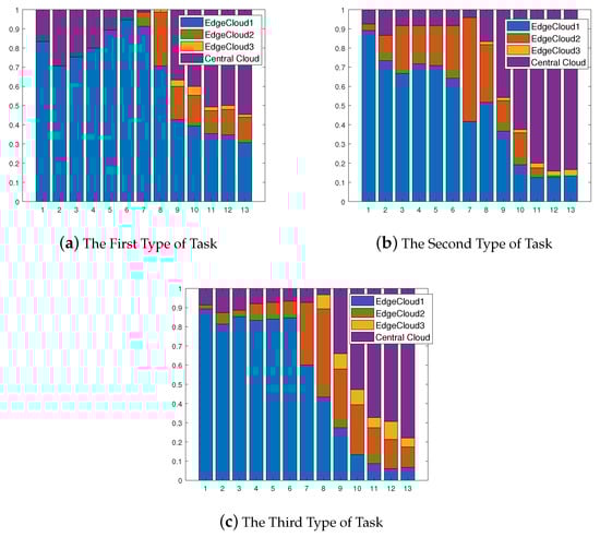 Figure 6 shows the adaption of cloud selection radio among mobile users in the same region along with iterative number. Figure 6a–c presents the cloud selection radio among mobile users who offload three different types of tasks, separately. We can observe that the proportion of cloud selection between edge clouds and the central cloud gradually converge in the three sub-figure, respectively. The adaption of cloud selection among mobile users in the same region can show the stability of our strategy.