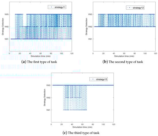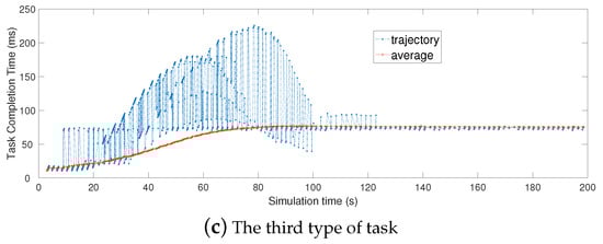 Figure 7 shows the trajectories of three types of task completion time in the same region. The change trend of average completion time for the same type of task in Figure 7 is also shown. In Figure 7a, mobile users, who all upload the first type of tasks, would eventually experience the stable task completion time, just as the same with Figure 7b,c.