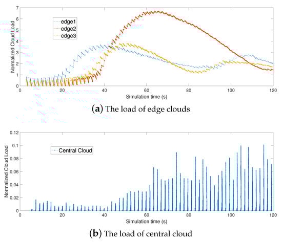 In the simulator, the MEC cloud platform has a central cloud and multiple edge clouds. Similar to Ref. [], the MEC platform is deployed in a network environment with hexagonal cellular structures. In the simulated MEC platform, we assume that there are three base stations (eNodeB), which are distributed evenly in a square area with dimensions of 3 km × 3 km. We partition the area into three regions of the same size. Each region is well covered by one eNodeB. An edge cloud is deployed in each region close to one eNodeB. According to the LTE-Advanced network [], we set the channel band to be 20 MHz. The transmission power of each eNodeB is set to be 50 dBm, so every eNodeB can cover each region of mobile users even considering the pass loss factor. The background noise is set to be −100 dBm [] for each mobile user. Each Mobile user in one region can share up to 100 Million bits per second (Mbps) for the down-link channel bandwidth, and up to 50 Mbps for the up-link channel bandwidth.