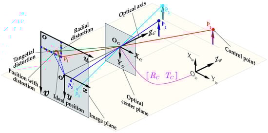 However, because of the complexity of the optical system, the imperfect imaging of the lens may lead to mapping errors . Thus, the first, and also the most important step, is to calibrate the parameters in the imaging model, since for close-range photogrammetry, the nonlinear imaging lens distortion, i.e., radial distortion and tangential distortion, is the main contributor to the measurement uncertainty. Therefore, to meet the high precision measurement requirement, the precise correction of these two manufacturing and assembly induced errors is mandatory. According to Brown’s model [], imaging distortion for traditional lenses (i.e., ordinary zoom or prime lens) satisfies: