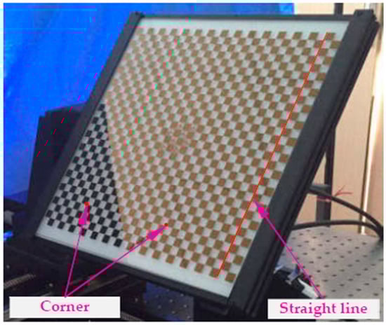The radial ( and ) and tangential ( and ) distortion in each subregion of the two known planes can be estimated by minimizing the straightness error of the corresponding straight lines. Then, based on Equation (6), the distortion partition and corresponding distortion coefficients of arbitrary object distance can be determined, which can give an optimal description of the distortion behavior in the DOF. To further improve the calibration accuracy, the determined distortion and the intrinsic parameters of the imaging model are locked, and calibration target (Figure 3) with high-precision grid distance is used to optimize extrinsic parameters: