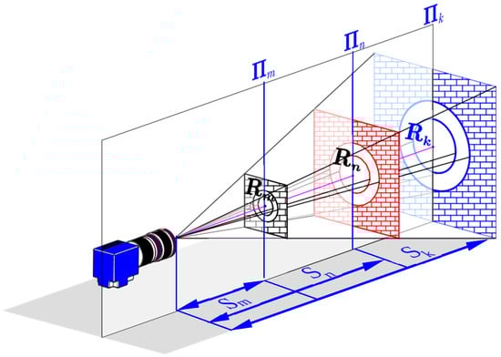 where depict the pixel coordinates without distortion. , and describe the radial distortion coefficients, respectively; the and represent the first- and second-order tangential distortion coefficients. However, for traditional camera calibration methods, distortion coefficients are calculated with and by minimizing the reprojection error, but these parameters will be coupled with each other. Consequently, a small reprojection error may occur when the distortion parameters are not well estimated. Therefore, to improve the camera calibration accuracy, distortion coefficients should be calculated separately. Furthermore, the existing calibration methods mainly focus on the use of a set of distortion coefficients to represent the distortion behavior of the imaging domain [], or the solution of the distortion of different depth object planes [,], when in fact, distortion in the DOF is position-dependent. Hence, for high accuracy distortion correction, the distortion behavior in the DOF needs to be processed more finely. For this intention, a camera calibration method considering the distortion partition of the DOF is proposed, of which the basic idea is to extend the equal-radius partitioned 2D distortion to the 3D imaging domain, and then to separately calibrate the distortion using plumb-line method [], after locking the obtained optimal distortion parameters in each partition, extrinsic parameters can be optimized.