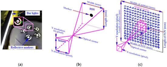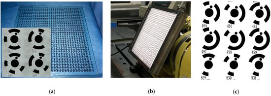 In practical vision measurement, it is necessary to add features to highlight the information of the object measured to be measured []. Thus, to precisely describe the movement information of the machine, markers should be installed at the end of the workbench as an enhanced feature. However, for machine motion capture scheme with bar lights radiating forward light for traditional reflective markers (Figure 5a). The unsatisfactory image quality (e.g., high reflection and image noise) and low marker manufacturing accuracy (shape error larger than 70 μm) limit the high-accuracy contouring error detection. To this end, our previous work [] proposed a cooperative target based on high-precision lithography and high uniform backward illumination. For such a “what-you-see-what-you-get” measurement scheme (Figure 5b), the wide range measurement capability depends entirely on wide FOV size and large camera resolution. Obviously, this costly measurement scheme is not feasible due to the limitations of the camera hardware. To address the problem, a monocular vision-based 3D high temporal-spatial measurement method for contouring error detection is proposed (Figure 5c). To enhance the marker encoding efficiency, the number of 1024 new fiducial markers (see Section 3.2) is designed and coded on the large-size artifact. As shown in Figure 6, the artifact (Figure 6a) is embedded in a cooperative target (Figure 6b) to describe the motion information. In addition, a flat backlight independent of ambient lighting is employed to enhance the markers to be inspected. A high signal-to-noise-ratio (SNR) value of 38.7 dB can be obtained for the marker image acquired by the proposed method.