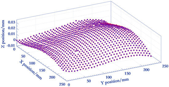 The photoetching technology (±0.5 μm) ensures the shape error of a single feature less than 1 μm. However, the big warp error of the large-size glass reduces the geometric accuracy among markers []. Thus, the 3D position of markers is calibrated by a HEXAGON OPTIV reference instrument (Qingdao, China, measurement error , : 0.25 μm + L/900, = 0.5 μm) as a priori information (Figure 7) to ensure the vision measurement accuracy under a wide range of conditions.