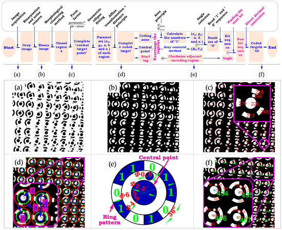 As shown in Figure 8b, image preprocessing (e.g., binarization, noise rejection) is conducted for the acquired gray image (Figure 8a) first, then the morphological clustering method [] is combined with the form factor to distinguish the center point and encoding regions. For detailed description, please refer to our previous work []. Thereafter, the five parameters of each closed region is obtained by the geometric ellipse fitting method.