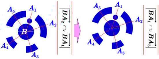 First, the center of the inner circle, denoted by , is located by the grey centroid method []. For each complete fiducial marker, a set of straight line vectors are formed by joining the center point and the centroid of the surrounding encoding regions. Then, straight line vectors are arranged in clockwise (Figure 9). Afterwards, the start tag is found (see Step 1) and considered to be the initial position to rearrange vectors, and we get .