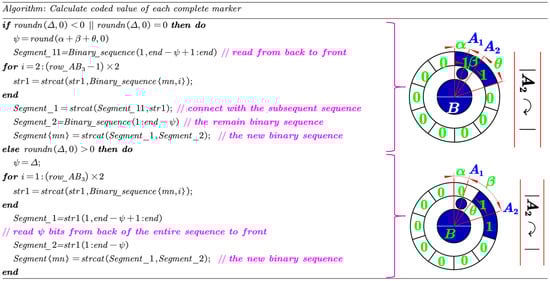 Let , where ; describes the angle between the start tag and its nearest encoding region along clockwise direction ( in Figure 11); denotes half of the number of “1” contained in the first clockwise encoding region. As illustrated in Figure 11, the coded value can be calculated by the following two cases: