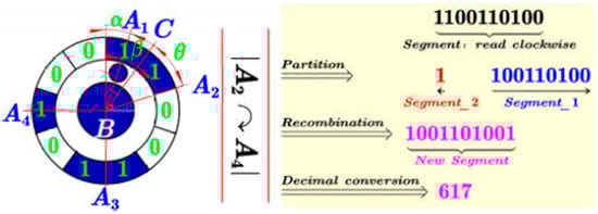 - Case 2:binary numbers from the back of the entire binary sequence to the front are read to form (Figure 13), and the remain binary sequence is denoted by . Then, the new segment is obtained by connecting to .
