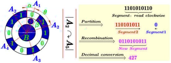 - Case 2: more than one encoding region around the central pointThe numbers of “0” in the non-encoding region between two adjacent encoding regions (Figure 10b) can be deduced by . Where describes the angle formed by adjacent two vectors (e.g., ), ; and are the numbers of “1” in two adjacent encoding regions. By traversing the entire ring pattern, we get the binary sequence of..