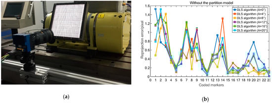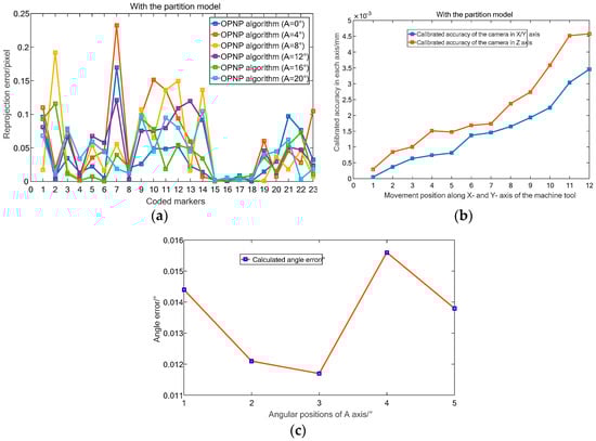 All algorithms were tested by image reprojection errors of the features at a fixed position without considering the proposed distortion partition model. Specifically, the target is driven by the A axis of the machine to rotate to six angular positions (Figure 14a). And, in each stop position, several features are used by the three codes to constructed the pose of a calibrated camera. Thereafter, the whole 23 features are projected back to the image via the , and the measurement accuracy of the three algorithms are compared by the reprojection error, which is the image distance between the projected point and a observed one.