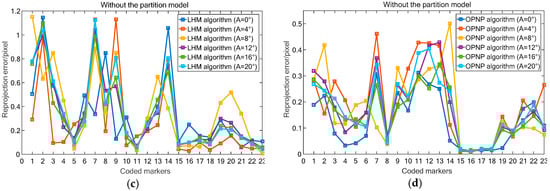 As illustrated in Figure 14, the maximum (average) reprojection errors of the six positions using the DLS (Figure 14b) and LHM (Figure 14c) algorithms are 1.52 pixel/0.45 pixel and 1.15 pixel/0.34 pixel. While, the maximum and average projection errors of the OPNP algorithm (Figure 14d) are 0.51 pixel and 0.17 pixel, respectively. Considering the verification results, the OPNP algorithm which returns high-accuracy pose estimation is selected in our paper.