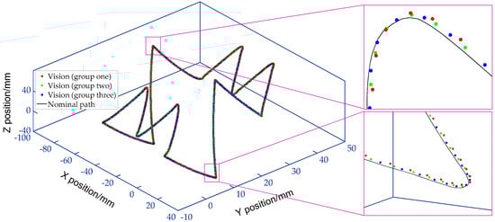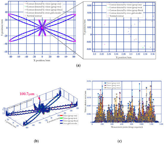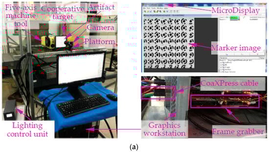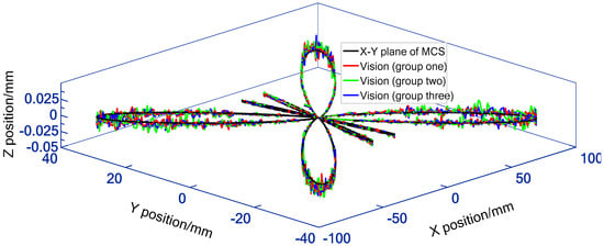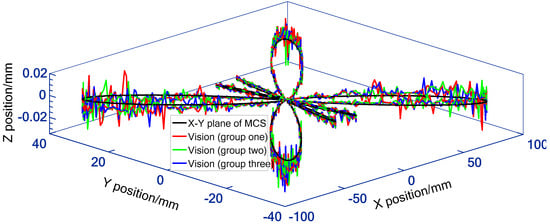 The vision measurement system is installed on the platform outside the machine (Figure 16c) to avoid vibrations. Considering the Z-direction variation (about 55 mm) of the spatial contour, the FOV and camera resolution are set to 60 × 60 mm and 3072 × 3072 pixels, respectively. Then, with the 0.03–0.05 subpixel accuracy of the gray centroid algorithm [], an ideal measurement accuracy of 2 μm can be obtained with a 50 mm focal length at focusing distance of 450 mm. Furthermore, under the imaging parameters, more than 9 markers can appear in each image frame to guarantee the feasibility of the PNP algorithm.