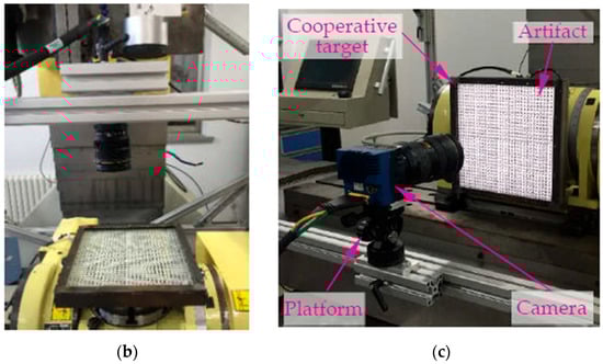 Since the control field (Figure 3) and the artifact (Figure 6a) can be exchanged in the designed cooperative target. Therefore, before the measurement, the cooperative target with the control field is first placed on the worktable. Then, combining with the coded markers, the camera pose is adjusted by the PNP algorithm. In the process, the intrinsic matrix in Equation (1) are repeatedly calibrated using Zhang’s method [], until the optical axis is perpendicular to the control field. Thereafter, the proposed camera calibration method considering the distortion partition of DOF in Section 2.2 is performed. The specific process and accuracy verification is detailed in Section 5.2.