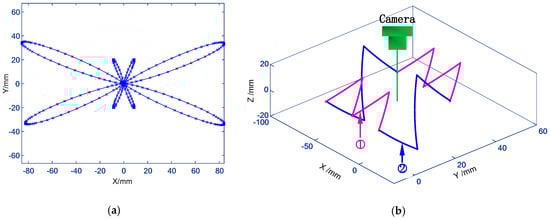 In our previous work [], due to the blurring effect caused by the fast movement of the target, the maximum measurable traverse speed was limited by 2 m/min. To demonstrate the capacity in synchronously extending the measurable range and speed, as well as of the 3D measurement of the contouring error. The contouring error of a large-scale butterfly curve (Figure 20a) is tested at 3 m/min and 5 m/min, respectively.