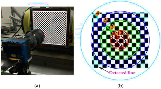 To remove the coupling effect of multiple parameters, the line control field is designed and then applied to calibrate the image distortion separately using the plumb-line method. As shown in Figure 3, the corner of the control field is used to calibrate the camera intrinsic parameters [] to calculate and adjust the pose of the target using the PNP algorithm, while straight lines are utilized to separately calibrate the image distortion of the image. Good pattern manufacturing quality is the premise for high-accuracy camera calibration. To this end, the lithography process is used to make patterns, the linewidth resolution accuracy can be guaranteed to be less than 1.0 μm. Besides, the distance error between two corners is less than 1.5 μm. In terms of partition, firstly, for a single 2D object plane perpendicular to the optical axis, the equal-radius partition method is presented to calculate the distortion in a more accurate way. Considering that the circularly and symmetrically distributed distortion varies with the increase of the distortion radius, the minimum distortion tolerance for image central area is taken as the threshold to calculate the partition radius , and the number of subregions can be solved by: , where is the maximum distortion radius; and depict the image width and image length, respectively.
