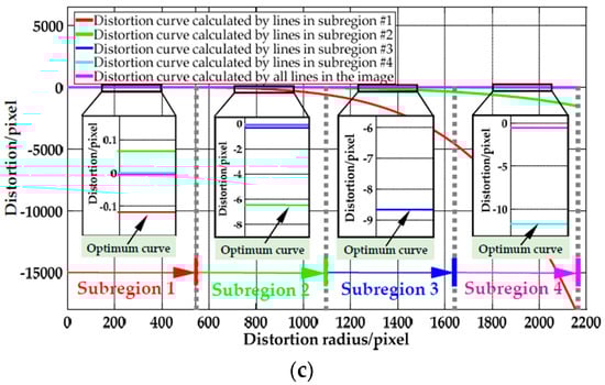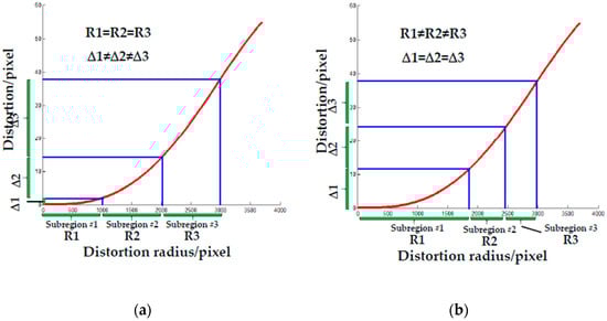 In this paper, a camera calibration method considering the distortion partition of the DOF is proposed, which allows the calculation of distortion coefficients of arbitrary object distance by two known object planes (Equation (6)). Therefore, before using the proposed method (Section 2.2) to calibrate camera parameters, the image plane should be installed parallel to the control field. In practice, combining with the Zhang’s method [], it is repeatedly adjusted by the PNP algorithm. And the alignment error can only be controlled within 0.1°, reducing the subsequent camera calibration accuracy. Additionally, the distortion coefficients describe the goodness-of-fit of the distortion in each subregion by minimizing the straightness error. For each region with equal partition radius R1 = R2 = R3 (Figure 29a), according to Equation (2), the calculated accuracy of distortion coefficients varies with different distortions Δ1 ≠ Δ2 ≠ Δ3. And the larger the distortion variation, the lower the estimation accuracy of distortion (see in Table 3). Thus, we assume that if the distortion in the object plane is partitioned by equal-distortion criterion (Figure 29b), i.e., Δ1 = Δ2 = Δ3. Then, although the partition radiuses are different R1 ≠ R2 ≠ R3, we can achieve high accuracy of distortion coefficient calculation. Our further study will focus on it.