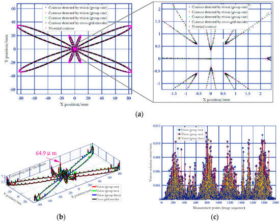 As mentioned in Section 5.2, we verified the accuracy of the proposed DOF distortion partition method, as well as the 3D measurement accuracy. On this basis, to further illustrate the advantages of the proposed monocular vision scheme in spatial contouring error detection over the existing equipment (e.g., telescoping ballbar and cross-grid encoder). The contouring performance of the interpolated spatial curve shown in Figure 20b is assessed at 3 m/min.