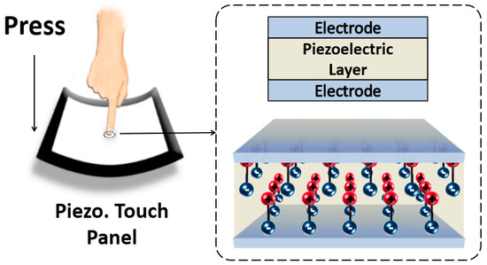 A typical structured piezoelectric force touch panel is shown in Figure 1. It can be observed that three layers are used to construct the touch panel: A thin piezoelectric film layer in the middle for responding to force touch events and two electrode layers, one on top and one underneath the piezoelectric layer, for conveying the force-induced electric signals [10,11,12,13,14,15]. When a force touch is applied at the surface of the piezoelectric touch panel, the polarization of the piezoelectric layer becomes positive or negative according to the direction of the applied force, hence attracting the charges at the electrodes to form an electric potential. The relationship between the applied force and the induced polarization can be expressed as follows [16,17]: