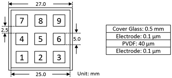 The experiment is carried out with a previously developed multi-layered prototype utilized in Reference [19], consisting of a top cover layer, nine evenly distributed electrodes, a piezoelectric thin film layer, a ground electrode layer, and a bottom cover layer. Figure 2 depicts the topology, together with its geometries.
