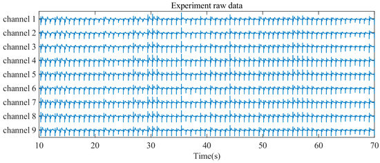 The voltages across the nine piezoelectric-based capacitors are continuously monitored. The retrieved raw data for one touch subset are given in Figure 3 as an example, including the raw data from the nine channels; each channel illustrates the relationship between voltage and time. Each peak in the raw data indicates a force touch event. Since the force-induced stress at one location can propagate to other areas, all nine channels produce an output signal when a touch event occurs. However, the amplitudes of the signals are different and depend on the stress distribution on the touch panel. Furthermore, as a complete force touch event consists of “press” and “release” actions, the polarizations of the piezoelectric layer change twice, resulting in positive and negative peaks, as illustrated in Figure 3. The “press” action induces a positive electric signal and is considered to represent the force level of the force touch event.