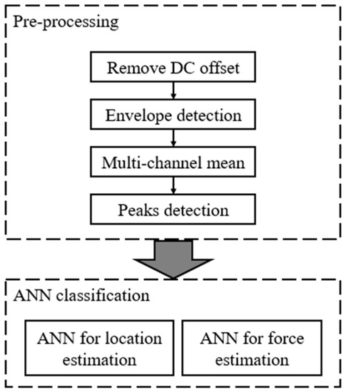 To obtain the information carried in the press-induced electric signals, a pre-processing algorithm has been developed through four steps to extract the voltage peaks from each channel, as shown in Figure 4. First, the direct current (DC) offset of each channel is removed by subtracting the mean voltage of each channel. Second, envelope detection is conducted to each channel by the Hilbert Transform method, as the voltage variations are both positive and negative. Third, we assume that the voltage variation peaks of different channels appear at the same time and calculate the mean value of the nine different channels to suppress random noise. Finally, the voltage peaks are detected by finding the local maximum voltage values. After the voltage peaks for each channel have been acquired, two ANNs are employed to classify locations and force levels. Their details will be given in the next sub-section.