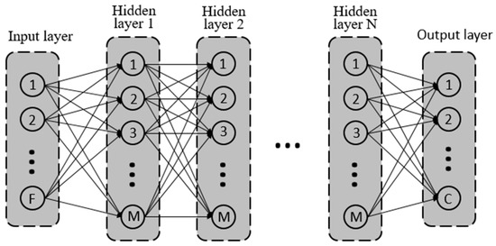 Schematic diagram of a fully connected artificial neural network (ANN). F is the number of features (nine for both force level and location classification); N and M are the hidden layer number and node number; C is the number of object classes (three for force level classification and nine for location classification). Note: Each hidden layer and output layer also have a bias input, which is ignored in this figure.