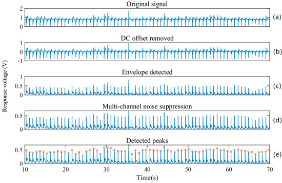 Signal pre-processing results: (a) original signal; (b) DC offset removed signal; (c) signal after envelope detection; (d) signal after multi-channel noise suppression; (e) detected signal peaks.