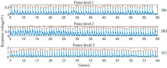 The pre-processing results after each step are plotted in Figure 6. One can observe that the DC offset at the original output signal is about 0.8 V (Figure 6a). After successfully removing the DC offset, the mean of the signal is close to 0 V (Figure 6b). The envelope detection algorithm is then applied to the offset-free signal, since there are positive and negative components during a force touch event (Figure 6c). Based on the assumption that voltage variation peaks of different channels appear at the same time, the mean value of the nine channels is calculated, as Figure 6d depicts. Finally, the peaks are located and marked by circles in the detected peaks figure. As Figure 6e confirms, the proposed pre-processing method is capable of appropriately detecting the peaks of the signal. Figure 7 shows the response voltages from one volunteer at the same location with different force levels. As shown, our prototype touch panel has different ranges of response voltage for different force levels.