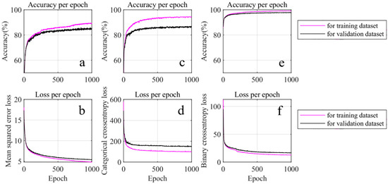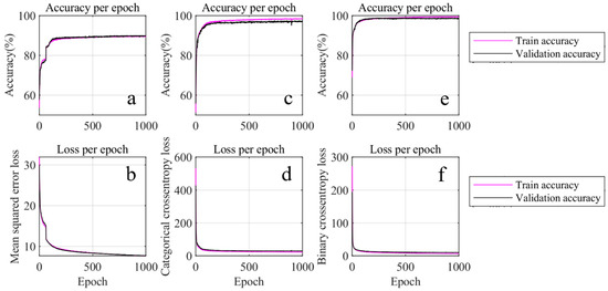 The cost function used for training can also greatly affect the performance [39,40,41,42,43,44]. Three commonly used cost functions have been chosen: The mean-squared-error loss function, the categorical cross-entropy loss function, and the binary cross-entropy loss function, and their classification accuracy was compared.
