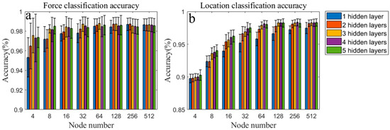 Figure 10 shows the correlation between the achieved accuracy and the fully connected ANN structure for different layer numbers and node numbers. Figure 10a shows the accuracy of force level classification. For layer numbers 1 to 3 and node numbers 4 to 32, the accuracy increases as the layer number or node number increases. The reason for this is that the ANN structure becomes more complex, hence, it can fit complex classification functions. However, when the layer number becomes larger than 3, and the node number greater than 32, no significant change in the accuracy is observed. Therefore, a layer number of 3 and a node number of 32 are selected for the force level classification in this paper. Figure 10b shows the accuracy of the location classification, which is slightly lower than that of the force level classification. As the layer number increases from 1 to 4 and the node number from 4 to 64, the accuracy also increases. However, for a layer number larger than 3 and a node number larger than 32, the accuracy does not change significantly. Thus, a layer number of 3 and a node number of 64 are chosen for location classification in this paper. Then, the accuracy of the test set is calculated as 97.7% and 97.0% for force and location classification, respectively.