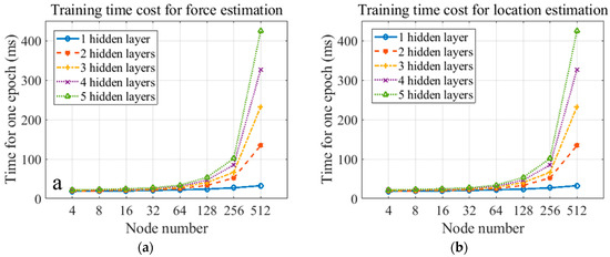 The training time costs for location and force level classification ANNs are given in Figure 11. The time cost remarkably increases when the node number is greater than 64. Also, it rises as the layer number increases. When the ANN has 5 hidden layers and 512 nodes, the maximum training time cost for location and force level classification are 418.2 and 424.8 ms/epoch, respectively.