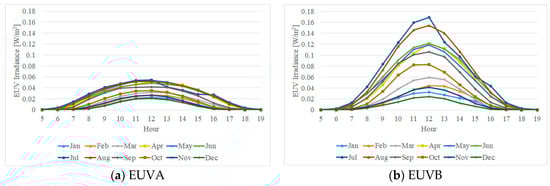 To create the monthly and hourly ratio index, the daily data that had poor measurement data due to clouds, fog, aerosols, and partial omission were excluded, and the ratio of each daily EUVB was collected by month and hour. Figure 1 shows the collected monthly EUVA and EUVB intensity values.