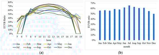 Monthly/hourly erythemally weighted UVB (EUVB) ratio index graph (a) and the average (b).